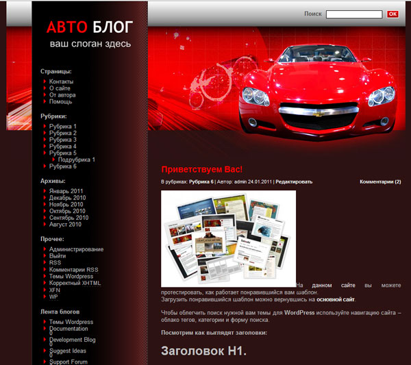 Ваш блог посвящен автомобильной тематике. Логично, если в его оформлении будут фото машин. Спорткар от Chevrolet красного цвета будет отлично смотреться в шапке вашего блога. Цвет машины на фото вверху страницы перекликается с красно-бордовым оформлением страницы. Белый цвет текста на темном фоне и строка поиска на серебристой полосе придадут блогу стильный и элегантный вид. Шаблон для удобства пользователя имеет структуру с двумя столбцами. Тема для WordPress под названием Car распространяется бесплатно.